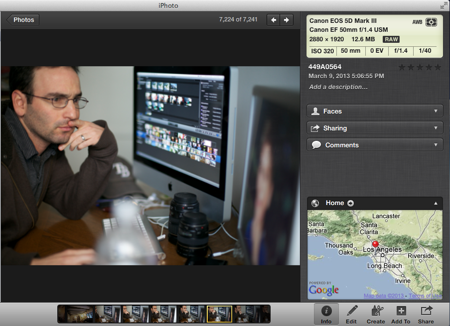 Then I select the photo(s) I want to give a location, go up to the EDIT menu,and select “PASTE LOCATION.” (Note: You can select more than one photo by pressing the COMMAND key as you click on them.)