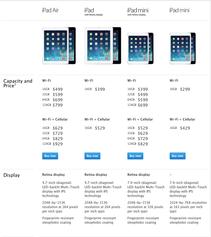 So there you go. If you want the most reasonable option, a 32GB iPad Mini with retina (wifi-only) is a great choice for most people. Consider only a larger screen, hard drive, or cell chip only if you really think you’ll need it.