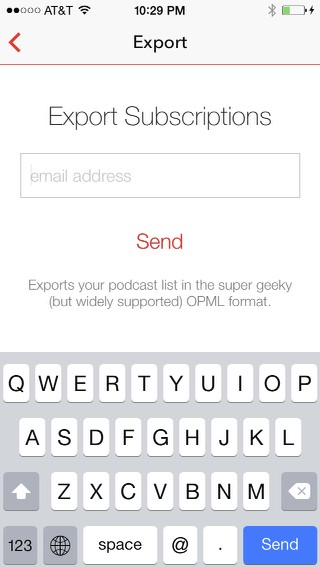 Just enter an email address you can check on your iPhone or iPad, and it’ll send the OPML file as an attachment to that address.  Open the message on your device, click on the attachment, and then use the “send to” feature (the little box with an arrow pointing up) to send the list to your new podcasting app.  On an android device, you might need to first save the file to your phone’s internal storage, then open it in the new app.