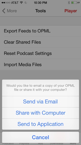 Downcast for iOS makes things a little easier.  Click on the “More” button at the bottom of the home screen, then click on “Tools.”  Select “Export Feeds to OPML” and you’ll see the option to send the file directly to a different application, no email required (unless you really want to use email).