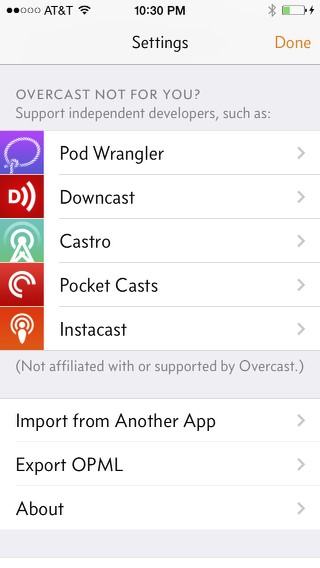 Pretty cool how Overcast will even recommend other apps you might like if Overcast isn’t your deal. (And I’m guessing all those apps use OPML.)