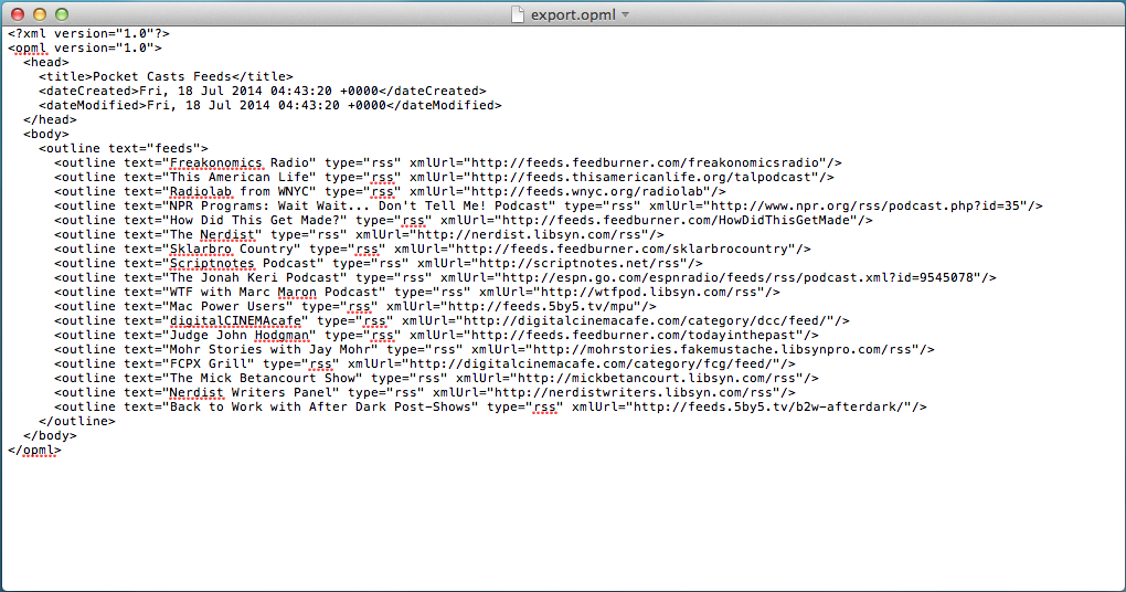 And if you’re really, really curious what exactly an OPML file looks like when you open it, here it is: