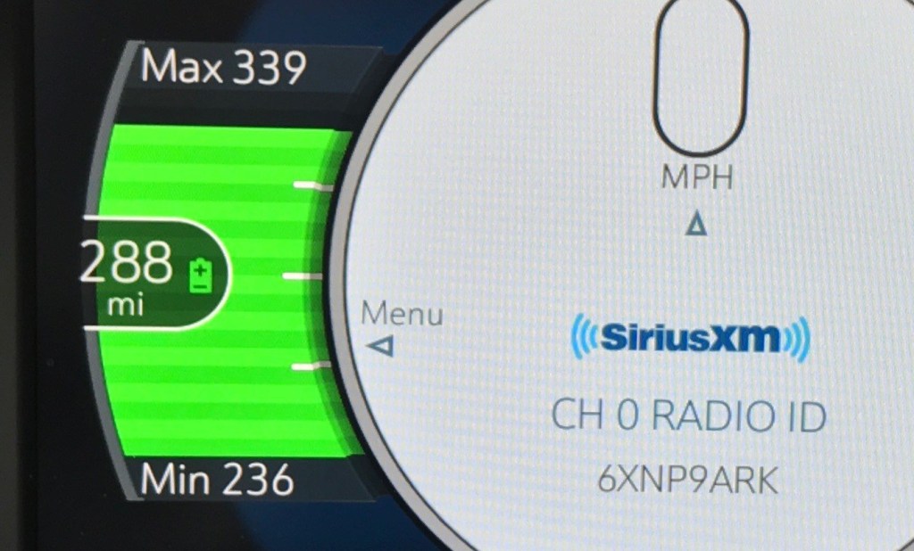 The Tesla offers the same amount of data, but it’s buried behind a couple menus. The only number that the Model 3 offers at a glance while driving is the “best guesstimate” (i.e., the equivalent of the number in the middle). Very useful, and pretty darn accurate, but the other numbers were nice to have, too.